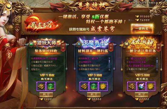 灭魔勇士:每日首亡不掉装备,击杀怪物经验+20%,专属称号及聊天标识‘灭’,每日50鲲鹏灵力和经验玉*2,材料副本扫荡次数+2(价格:30000元宝,有效期:30天)