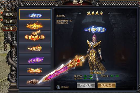 称号:激活称号获得对应属性,已激活的称号属性值会累加,同类型称号只能佩戴一个